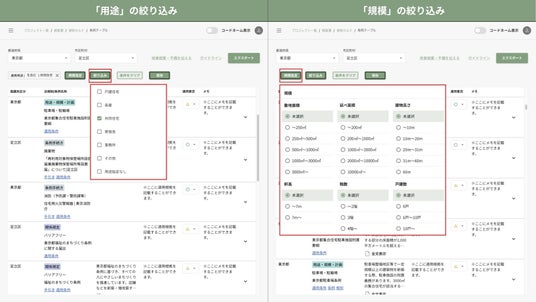 自治体ごとにかかる可能性のある条例を一覧検索できる機能です。建物の用途、規模などで絞り込むことができ、調査時間を大幅に短縮することができます。