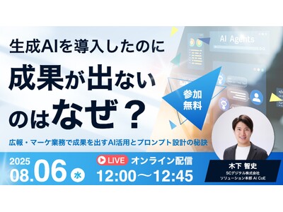 SCデジタル株式会社(代表取締役 社長執行役員CEO:中橋大樹、以下「SCデジタル」)は、2025年8月6日(水)に、広報・マーケティング業務における生成AIの活用と、成果につなげるためのプロンプト設計・実践法をテーマにした無料オンラインセミナーを開催します。