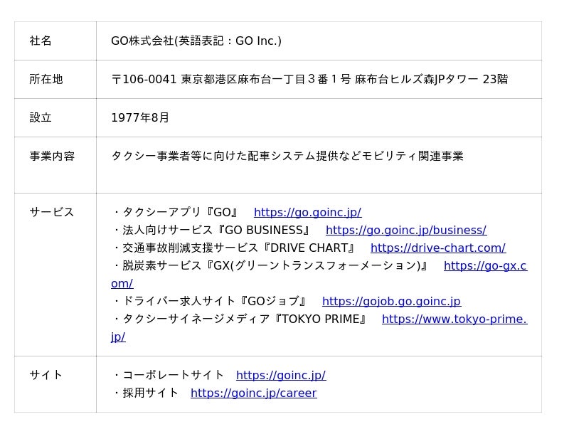 GO株式会社は、「移動で人を幸せに。」をミッションに掲げ、モビリティ領域を軸とする多様な事業・サービスを展開しています。協働パートナーの皆さまとの共創力と、テクノロジーを最大限に活用する開発体制のもと、時代に合わせた「移動」のアップデートを通じて、日本の社会課題の解決を目指します。