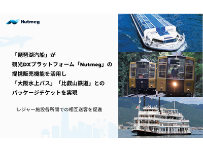 NutmegLabs Japan株式会社(代表取締役:中口 貴志、本社:東京都千代田区、以下「当社」)が提供する、旅行・レジャーにおける現地体験事業者向け観光DXプラットフォーム「Nutmeg(ナツメグ)」にて提携販売機能を活用し、2025年7月15日より琵琶湖汽船株式会社(代表取締役社長:金澤 一徳、本社:滋賀県大津市)が運航する「ミシガンクルーズ」と大阪水上バス株式会社(取締役社長:奥村 茂之、本社:大阪市中央区)が運航する「大阪水上バス アクアライナー」、比叡山鉄道株式会社(代表取締役社長:仁賀 剛、本社:滋賀県大津市)が運行する「坂本ケーブル」との提携販売を開始いたしました。