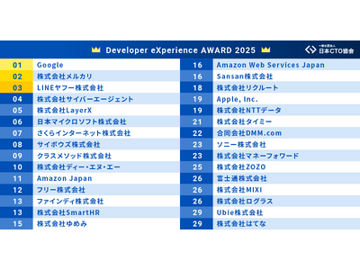 ITエンジニアが不安なく挑戦できる世界共通のプラットフォームを構築し、累計利用者登録数20万人、登録社数3,000社(※)が利用するITエンジニアと企業のマッチングサービス、及びエンジニア組織支援SaaSを提供するファインディ株式会社(本社:東京都品川区、代表取締役:山田 裕一朗、以下「当社」)は、一般社団法人日本CTO協会が実施した、エンジニアが選ぶ「開発者体験が良いイメージのある企業ランキング」において、2025年度版で13位にランクインしたことを発表します。これは、当社が初選出された2024年度の23位から大幅な順位アップとなり、初のTOP15入りです。