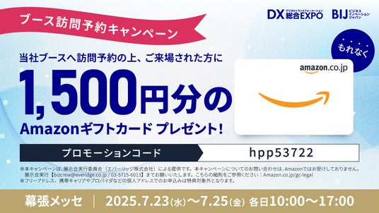 ・本キャンペーンは展示会実行委員会(エバーリッジ株式会社)による提供です。本キャンペーンのお問い合わせは弊社、Amazon社ではお受けしておりません。展示会事務局【bizcrew@everidge.co.jp】までお願いいたします。