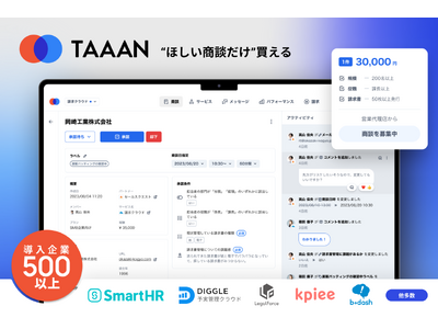「TAAAN(ターン)」は、500社を超える企業に選ばれている、完全成果報酬型の商談創出プラットフォームです。企業が設定したターゲット条件に合致した商談だけを提供し、営業活動の効率化と成約率向上を実現しています。直感的に操作可能なダッシュボードを備え、商談管理をよりシンプルかつ効率的にします。