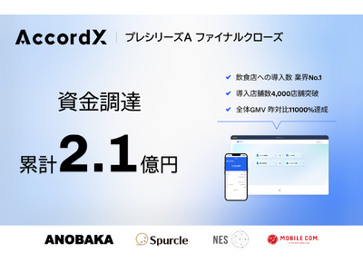 株式会社AccordX(本社:東京都港区、代表取締役:安井一男、以下「当社」)は、株式会社ANOBAKAをリード投資家として、スパークル株式会社、NES株式会社、株式会社モバイルコムを引受先としてプレシリーズAラウンドにおける資金調達を実施したことをお知らせします。この度の資金調達によって累計調達額は2.1億円(デット含む)となりました。各投資家のコメントは本リリース末尾を参照ください。