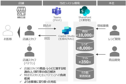 富澤商店はJarminalとともに、Microsoft365環境に生成AIチャットボットを導入。AIが社内に蓄積された情報を検索・参照し、店舗スタッフの質問に自然言語で答える仕組みです。RAG(Retrieval Augmented Generation)技術を活用し、かつ、Copilot Studioで内製可能な運用体制を整えています。