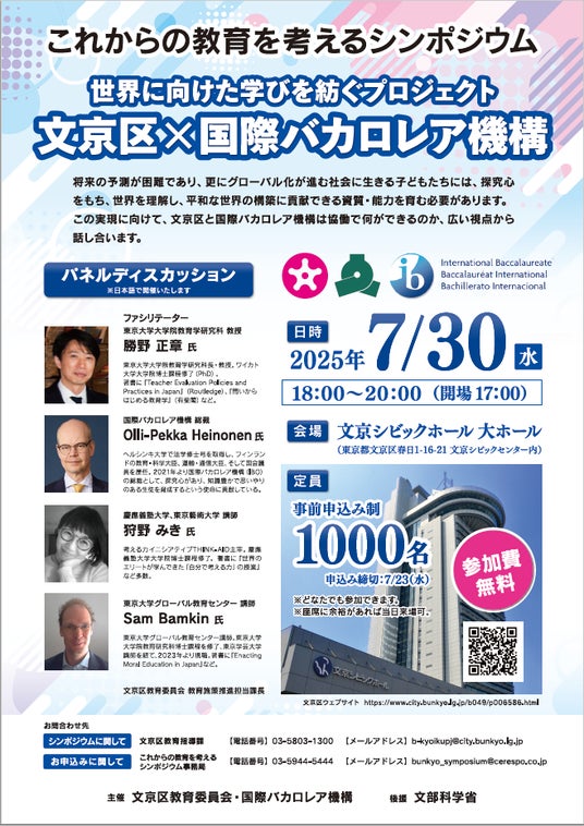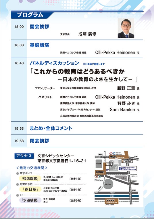 将来の予測が困難であり、更にグローバル化が進む社会で生きる子どもたちには、探究心をもち、世界を理解し、持続可能な社会及び平和な世界を築くことに貢献できる資質・能力を育む必要があります。この実現に向けて、文京区と国際バカロレア機構は協働で何ができるか、広い視点から話し合います。