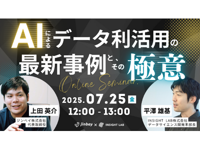 INSIGHT LAB株式会社(本社:東京都新宿区、代表取締役社長:遠山 功、以下「INSIGHT LAB」)は、ジンベイ株式会社(本社:神奈川県横浜市、代表取締役:上田 英介、以下「ジンベイ」)と共催で、「AIによるデータ利活用の最新事例とその極意」についての無料オンラインセミナーを2025年7月25日(金)に開催いたします。