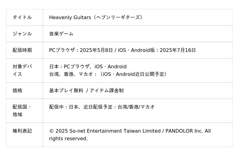 ソネットゲームスタジオ株式会社(所在地:東京都品川区、代表取締役社長:永田博丈)は、エレキギターにフォーカスした対戦型音楽ゲーム『Heavenly Guitars(ヘブンリーギターズ、以下本作)』のiOS/Android版アプリを、本日2025年7月16日よりリリースいたしました。