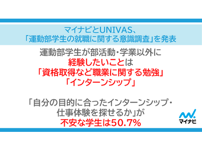 運動部学生が部活動・学業以外に経験したいことは「資格取得など職業に関する勉強」「インターンシップ」。「自分の目的に合ったインターンシップ・仕事体験を探せるか」が不安な学生は50.7%