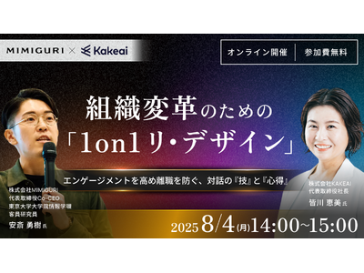 1on1ミーティングをはじめとする面談サポートシステム「Kakeai(カケアイ)」を開発・運営する株式会社KAKEAI(本社:東京都渋谷区 代表取締役社長 皆川恵美、以下KAKEAI)は2025年8月4日(月)にオンラインセミナー「組織変革のための1on1 リ・デザイン」を開催することをお知らせします。