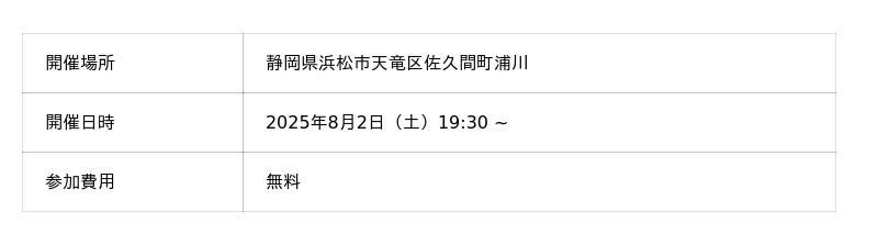 ライブ配信アプリ「everylive(エブリライブ)」が協賛する『浦川まつり花火大会』の情報をお届けします(2025年8月2日[土]静岡県浜松市にて開催予定)。