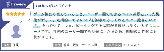 YuLifeアプリは、従業員の定着率UP・満足度や生産性の向上を実現する、オールインワンの福利厚生・健康管理アプリです。ゲーム感覚で楽しめる健康促進プログラムや、日々の活動に応じて魅力的な商品・サービスとポイントを交換できるリワード(報酬)制度などを通じて、従業員の健康的な行動を促進・コミュニケーション活性化をサポートします。顧客満足度5点満点中4.5点といった高い評価を継続的に得ており、ユーザーの皆さまからは以下のような評価をいただいております。