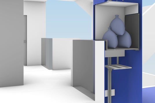 ロボット床下収納を中心に、実際に収納可能なサイズを確認できるボックスや、荷物運搬ロボットの実物大モックを展示します。