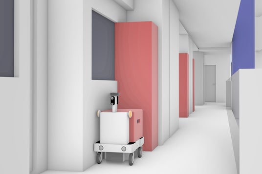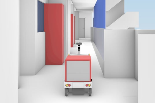 マンションの廊下を進む 小型の自動配送ロボット