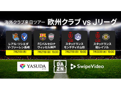 AMATELUS株式会社(本社:東京都渋谷区、代表取締役:下城 伸也、以下 AMATELUS)とスポーツ・チャンネル「DAZN(ダゾーン)」は、AMATELUSが有する国際特許技術を活用した自由視点映像配信/マルチアングル映像配信システム「SwipeVideo」(スワイプビデオ)を活用して連携し、株式会社ヤスダグループ(本社:東京都港区、代表:安田慶祐)が主催または主管する「レアル・ソシエダ ジャパンツアー2025」「スタッド・ランス ジャパンツアー2025」および「ヴィッセル神戸30周年記念チャリティーマッチ『FRIENDLY MATCH』ヴィッセル神戸vs. FCバルセロナ」の中から4試合をマルチアングル生配信およびアーカイブ配信をすることを決定いたしました。全試合ともペイパービュー(PPV)方式で「SwipeVideo」にて販売、配信が行われ、DAZN会員以外でもご購入・ご視聴いただくことが可能です。