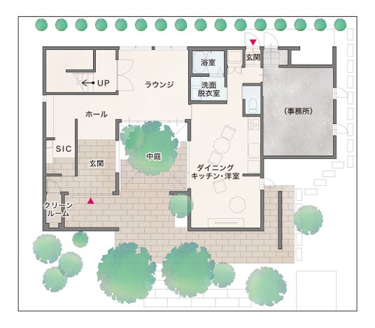 子育て世帯の豊かな暮らしを考えた都市型住宅1階には二世帯住宅や賃貸併用の住まい方を想定した間取りを加え、専用玄関と独立した水廻りを設けました。中庭から自然の光が注ぎ、四季のうつろいを感じられるメインエントランスには「ただいま手洗い」「クリーンルーム」を設置しています。