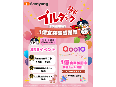 フードやドラマ、ファッションなどのKコンテンツブームとの相乗効果もあり、ブルダックは25年上半期時点で日本国内累計販売数((1)※)1億食を突破しました。三養ジャパンは1億食突破を記念し、「1億食突破感謝祭」を7月17日から7月31日まで実施いたします。