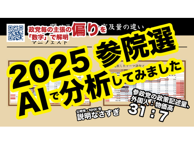 本特設サイトは、AIによる定性情報の定量化分析技術を活用した選挙分析サイトであり、2022年参院選・2024年都知事選に続く第3弾となります。5回連続シリーズとして、参院選の投票日直前まで、各回ごとに異なる観点の分析結果を公開していきます。