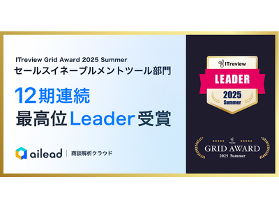 株式会社ailead(本社:東京都港区、代表取締役:杉山大幹)が提供する商談解析クラウド「ailead (エーアイリード)」は、「ITreview Grid Award 2025 Summer」のセールスイネーブルメントツール部門においてユーザーからの高評価の称号「Leader」を受賞致しました。今回で「Leader」の受賞は、セールスイネーブルメントツールとしては12期連続となります。
