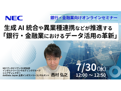 生成AIと統合した営業・マーケティングや、様々な企業連携で急速に重要性が高まっている金融・流通の異業種連携(生活スタイルを反映する小売・購買データを活用した金融ビジネスの推進)の事例など、銀行・金融業のDX戦略を深掘りし、新たな価値創出につながる具体的なヒントをお届けします。スピーカーは、金融業をはじめとして様々なお客さまのプロジェクトを推進する、NEC/dotDataのインダストリーコンサルタントの西村が担当します。