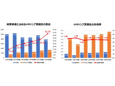 2025年5月のFP1級学科試験において、総受検者3,909名のうちFPキャンプ受講生が占める割合は42.7%※1となり、全体の4割超に達しました。FPキャンプが開講した2023年7月以降、受検者に占める受講生の割合は6回連続で右肩上がりの成長を続けています。また、今回のFPキャンプ受講生の合格率は85.71%※2と、全体の合格率18.75%の約4.6倍を記録。2023年7月以降の試験において、6回連続で全体合格率の4.5倍を超える高い合格率を達成しています。