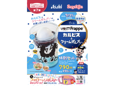 この「Sugakiya with」第7弾として、甘ずっぱく爽やかなカルピス(R)とスガキヤの人気デザートクリームぜんざいが、今年の夏初登場のスガキヤのシャリッと甘い新食感の「スーちゃんフラッペ」で楽しめます。