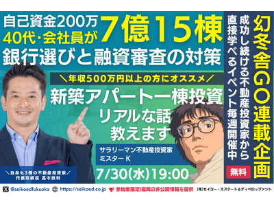 福岡で不動産投資・新築アパート経営を始めたい年収500万円以上の方は参加必須。幻冬舎GO記事で取り上げたサラリーマン投資家本人が登壇!セイコー・エステートが無料セミナーを2025年7月26日に開催。