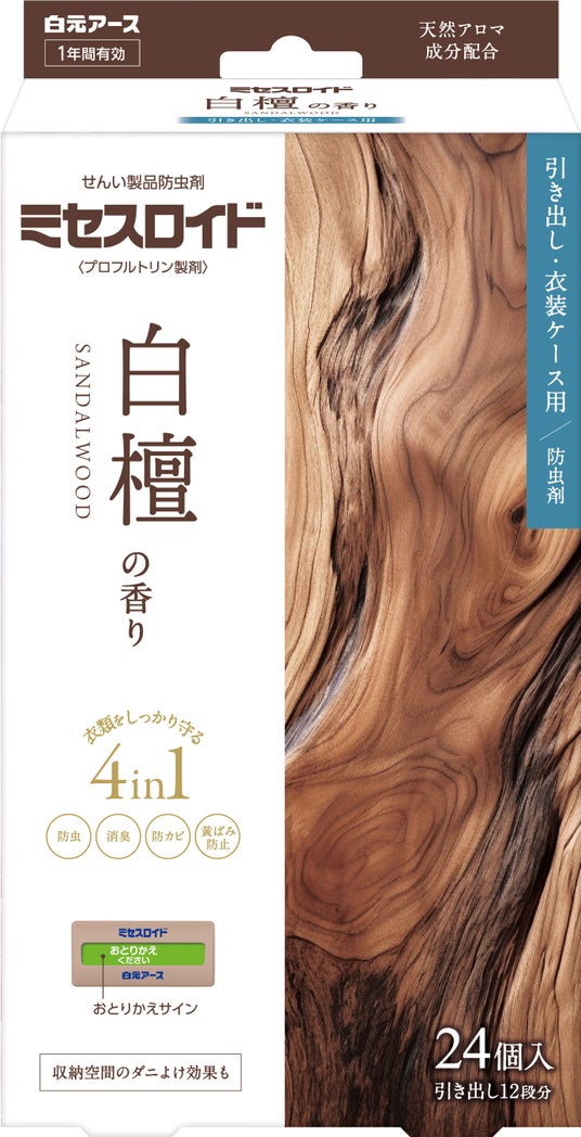 そこで今回、『ミセスロイド 白檀の香り』を数量限定で発売いたします。ふわっと香る、心やすらぐ柔らかな温かみのある白檀の香りが収納空間に広がり、衣類をやさしく包む芳香タイプの衣類用防虫剤です。また、大切な衣類を守る「防虫」「消臭」「防カビ」「黄ばみ防止」の4つの機能と、「収納空間のダニよけ効果※」を搭載した多機能タイプとなっています。パッケージデザインは、白檀の香りが店頭でイメージしやすいように大きく木目を使用した和テイストを採用しました。ラインナップは「引き出し用」「クローゼット・洋服ダンス用」「ウォークインクローゼット用」の3種類で展開します。