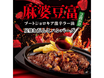 今回新登場する「麻婆豆富ブートジョロキア激辛ラー油2段がけ 炭焼きがんこハンバーグ」は、当店自慢の牛肉100%を使用した「ブロンコおじさんのこだわり炭焼きがんこハンバーグ」の上に、旨みたっぷりミンチの麻婆豆富を大胆に流し込みます。グツグツ煮立った鉄板に、世界トップクラスの辛さで人気のある“ブートジョロキア”の粉末入りの激辛ラー油を、お客様のご要望で1杯から3杯かけ、お好みの辛さで楽しめます。麻婆豆富とハンバーグが絶妙に絡み合い、辛いのにまた一口、また一口食べたくなる逸品に仕上がりました。