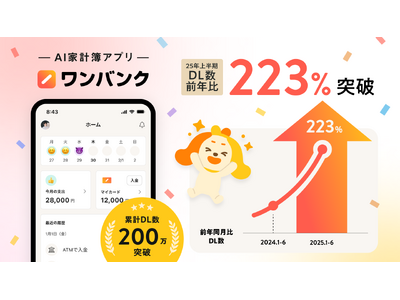 株式会社スマートバンク(本社:東京都品川区、代表取締役:堀井 翔太、以下「スマートバンク」)は、開発・運営しているAI家計簿アプリ「ワンバンク」の2025年上半期の新規ダウンロード数が昨年同期比223%で急増し、累計200万ダウンロードを突破したことをお知らせします。