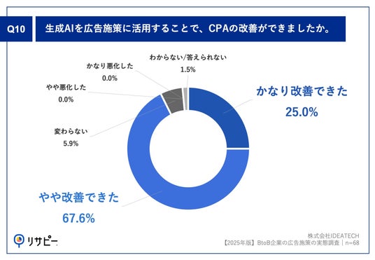 「Q10.生成AIを広告施策に活用することで、CPAの改善ができましたか。」(n=68)と質問したところ、