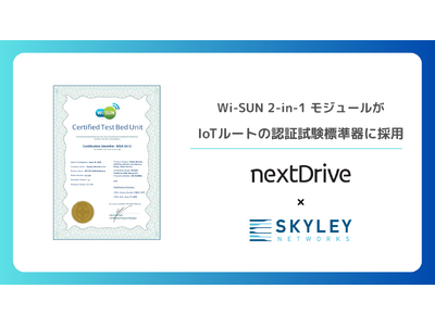エネルギーマネジメントソリューションを提供するNextDrive株式会社(東京都港区西麻布3-19-22/代表取締役社長:顔哲淵/以下「NextDrive」)とNextDriveグループで無線ネットワークソフトウェア開発を行なう株式会社スカイリー・ネットワークス(神奈川県横浜市港北区新横浜3-6-12/代表取締役社長:梅田 英和/以下「スカイリー・ネットワークス」)が提供する、Wi-SUN 2-in-1 モジュール「ND 7351」がWi-SUNアライアンス※1 が策定する「Wi-SUN Profile for HAN (Route IoT)」の認証試験標準器 (CTBU: Certified Test Bed Unit, 公認テストベッドユニット)※2 に採用されました。