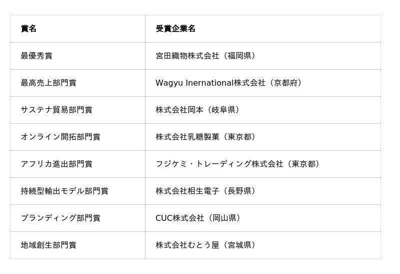 本表彰は、STANDAGEと共に海外進出を実現した企業の成果を称えると同時に、他の企業にとってのロールモデルを提示することを目的としています。昨年度は5社の表彰でしたが、今年度は部門数を8つに拡大。「最優秀賞」「最高売上部門賞」「サステナ貿易部門賞」「オンライン開拓部門賞」「アフリカ進出部門賞」「持続型輸出モデル部門賞」「ブランディング部門賞」「地域創生部門賞」の8部門において、
