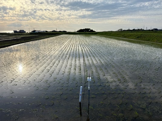 水位と土壌水分計を用いて、中干し延長期間と土壌水分の関係性を調査(乾燥ストレスで収量落とさない技術の開発風景):石川県羽咋郡フェイガー実験農場にて(2025年6月20日撮影)