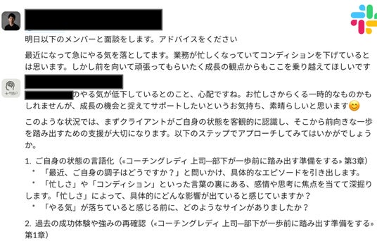 Slackとの連携により、日々のワークフローの中で手軽にご活用いただけます。Slack上でアカウントをメンションするだけでAIコーチを呼び出すことができ、新たなツールの導入や操作を覚える手間なく、スムーズにコーチング支援を受けられます。 (※今後はSlack以外のチャットツールへの展開も予定しています。)