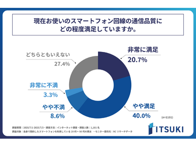 株式会社ITSUKI(本社:東京都北区、代表取締役:岩下 一樹)は、自身で契約したスマートフォンを利用している20代~50代の男女を対象に「スマートフォンユーザーの通信サービス利用実態」に関する調査を実施しました。この調査から、自身で契約したスマートフォンを利用している人の月間通信量や料金プランの満足度、通信速度・通信品質への評価などが明らかになりました。