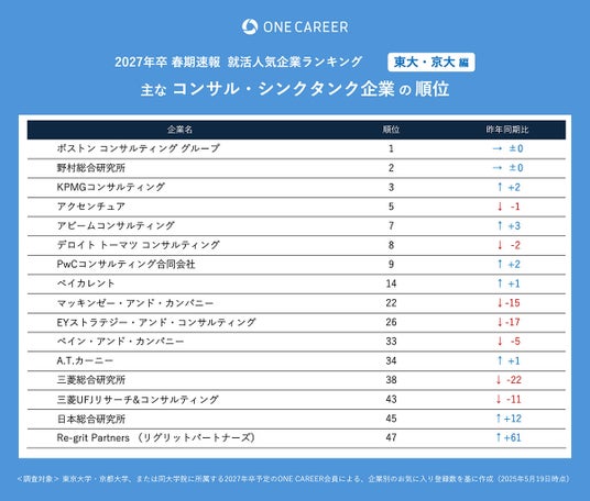 株式会社Re-grit Partners(本社:東京都千代田区、代表取締役:山木 智史、以下「リグリットパートナーズ/当社」)は、就活サイト「ONE CAREER」が発表する『就活人気企業ランキング2025【東大・京大編】27卒春期速報』において、全体47位、コンサル・シンクタンク部門で16位にランクインしました。前年から61位も順位を上げてのTOP50入りは極めて異例で、学生からの注目の高さが反映されているものと捉えています。