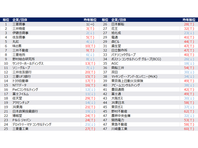 メーカー各社は堅調な人気を維持しつつ、味の素(昨年10位→今年6位)、サントリー(昨年13位→今年10位)、資生堂(昨年47位→今年31位)、日立(昨年47位→今年32位)などの大手企業が軒並み順位を上げました。