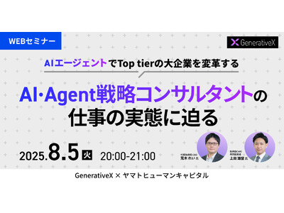 ヤマトヒューマンキャピタル株式会社(本社:東京都千代田区、代表取締役:堀江 大介)は、2025年8月5日(火) 20:00よりオンラインにて、株式会社GenerativeX 代表取締役CEO 荒木 れい 氏、取締役 CAIO/ 共同創業者 上田 雄登 氏にご登壇いただくウェビナー『AI・Agent戦略コンサルタントの仕事の実態に迫る』を開催いたします。