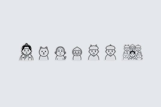 桃太郎と仲間たちが一人ずつデザインされたステッカーと、仲間たちが集合したステッカー。ノートやファイル、スマートフォンケースなど、お好きな場所に貼って、自分だけのオリジナルアイテムを彩りましょう。