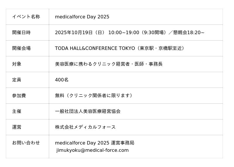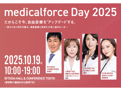 クリニック向けオールインワンSaaS「medicalforce」を提供する株式会社メディカルフォース(所在地:東京都品川区、代表取締役CEO:畠中 翔一)は、クリニック経営者・医師対象のオフラインイベント「medicalforce Day 2025」を、10月19日(日)にTODA HALL&CONFERENCE TOKYOにて開催いたします。美容医療に携わる経営者・医師・事務長400名が一堂に会する大規模イベントの特設サイトをオープンし、本日よりお申し込みいただけます。