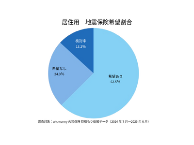 Mt.flowers株式会社(本社:東京都江東区)が運営する火災保険一括見積もりサービス「wismoney(ウィズマネ)」は、当サービスにて「居住用」として見積もり依頼があったデータをもとに、2024年7月~2025年6月の期間における地震保険の希望状況(希望あり・希望なし・検討中)について、建物の築年数や種別(一戸建て・共同住宅)ごとに集計しました。