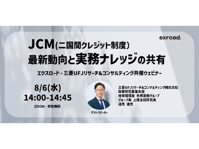 カーボンクレジット・排出量取引制度オールインワンデータベースを提供する株式会社exroad(エクスロード、本社:東京都港区、代表取締役:木村圭佑)は、「JCM(二国間クレジット制度)の最新動向と実務ナレッジの共有」と題し、三菱UFJリサーチ&コンサルティング株式会社と共同で、8月6日(水)14:00‐に無料ウェビナーを開催いたします。