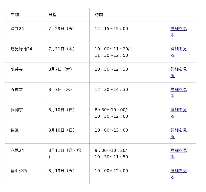 参加対象者や料金・申し込み方法は、各店舗にお問い合わせ、もしくはホームページにてご確認ください。