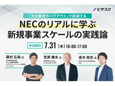 「知見と、挑戦をつなぐ」をミッションにグローバルなナレッジプラットフォームを運営する株式会社ビザスク(以下、当社)は、「NECのリアルに学ぶ、新規事業スケールの実践論」をテーマに、日本電気株式会社 みらい価値共創部門 ビジネスイノベーション統括部 ディレクター 藤村 広祐 氏、株式会社hootfolio Co-Founder & CEO 笠原 健太 氏、BIRD INITIATIVE株式会社 CSO 高木 政志 氏の3名様ご登壇による無料オンラインセミナーを 7/31 (木) 16:00 より開催します。