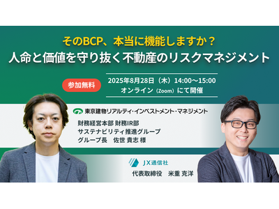 防災DXを推進する報道ベンチャーの株式会社JX通信社(東京都千代田区、代表取締役 米重 克洋、以下「JX通信社」)と、株式会社東京建物リアルティ・インベストメント・マネジメント(東京都中央区、代表取締役社長 城崎 好浩、以下「東京建物リアルティ・インベストメント・マネジメント」)は、8月28日(木)に共催ウェビナーを開催することをお知らせします。