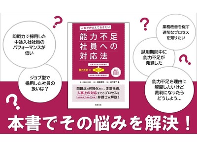 株式会社労務行政(所在地:東京都品川区 代表取締役:石川 了)は、新刊『人事が押さえておきたい 能力不足社員への対応法』を発売します。労働問題・労使トラブル解決の第一線で活躍する西頭英明弁護士、柏戸夏子弁護士(第一芙蓉法律事務所)が、能力不足社員への対応に関するノウハウを詰め込んだ一冊です。