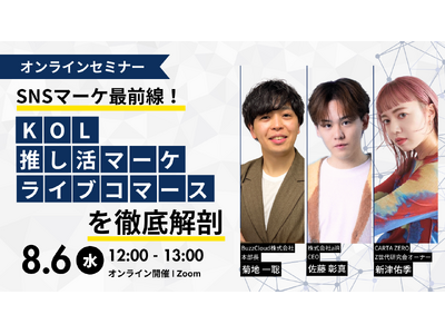 購入を前提とした推し活マーケティング支援を行うBuzzCloud株式会社(本社:東京都港区、代表取締役:大西 照弘)は、デジタルマーケティング領域に強みを持つ株式会社CARTA ZERO(本社:東京都港区、代表取締役CEO:宇佐美 進典)、若年層向けのプロモーション事業を行う株式会社aiR(本社:東京都世田谷区、代表:佐藤 彰真 以下aiR)と、【SNSマーケ最前線!KOL・推し活マーケ・ライブコマースを徹底解剖】と題したウェビナーを、 8/6(水)12時に開催いたします。