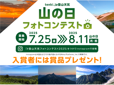 一般財団法人 日本気象協会(本社:東京都豊島区、理事長:渡邊 一洋、以下「日本気象協会」)は、登山者のための山の天気予報専門アプリ「tenki.jp 登山天気」にて、「tenki.jp 登山天気 山の日フォトコンテスト 2025」(以下、本コンテスト)を、2025年7月25日(金)から8月11日(月・祝[山の日])にかけて開催します。