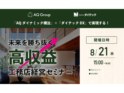 株式会社ダイテック(本社:東京都品川区、代表取締役社長:野村明憲、以下ダイテック)と株式会社AQ Group(本社:埼玉県さいたま市、代表取締役兼社長執行役員:加藤博昭、以下AQ Group)は、住宅業界で活躍されている皆さまを対象に、共催セミナー「未来を勝ち抜く高収益工務店経営セミナー」を2025年8月21日(木)にオンラインで開催します。